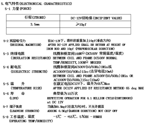 | 电压: | DC12V | 行程: | 3.5MM | 电阻: | 40欧 | 功率: | 3.6W |